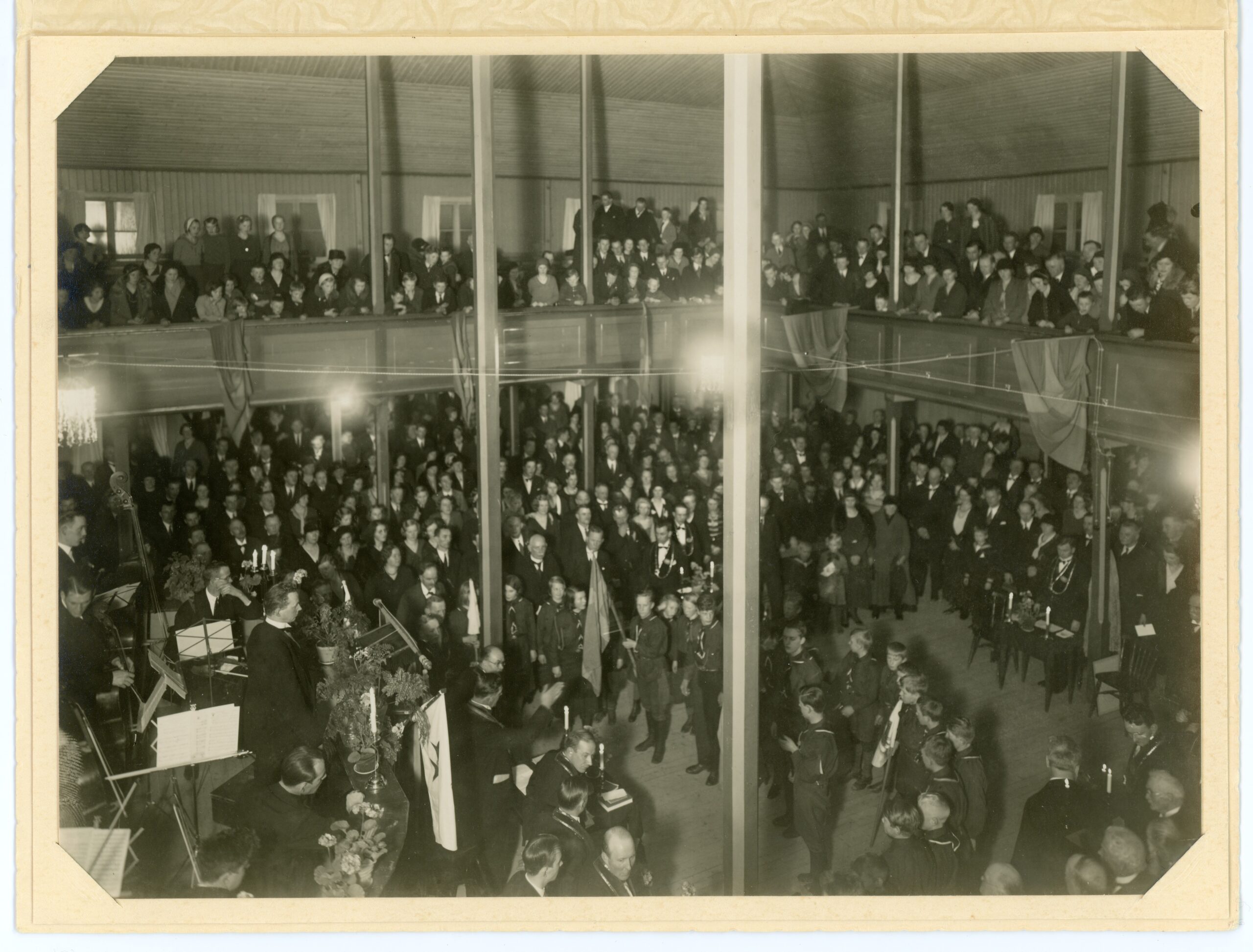 Stor folksamling och fest inuti tvåvåningsbyggnad med orkester på scen.