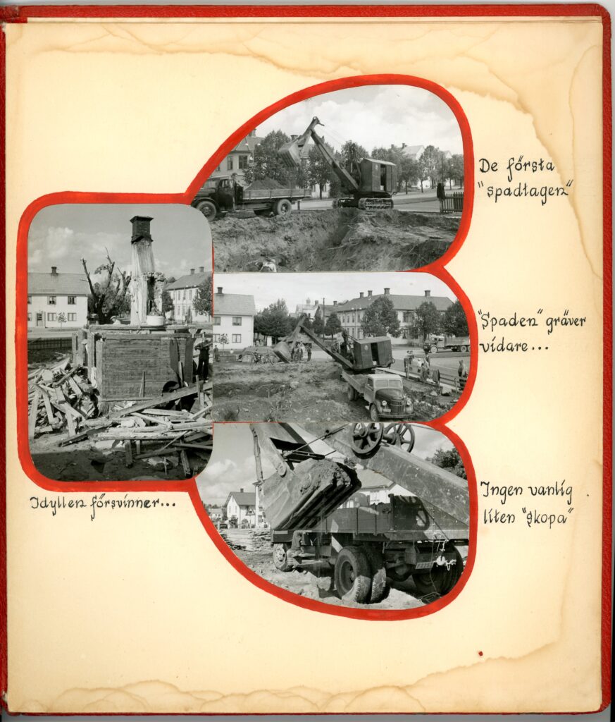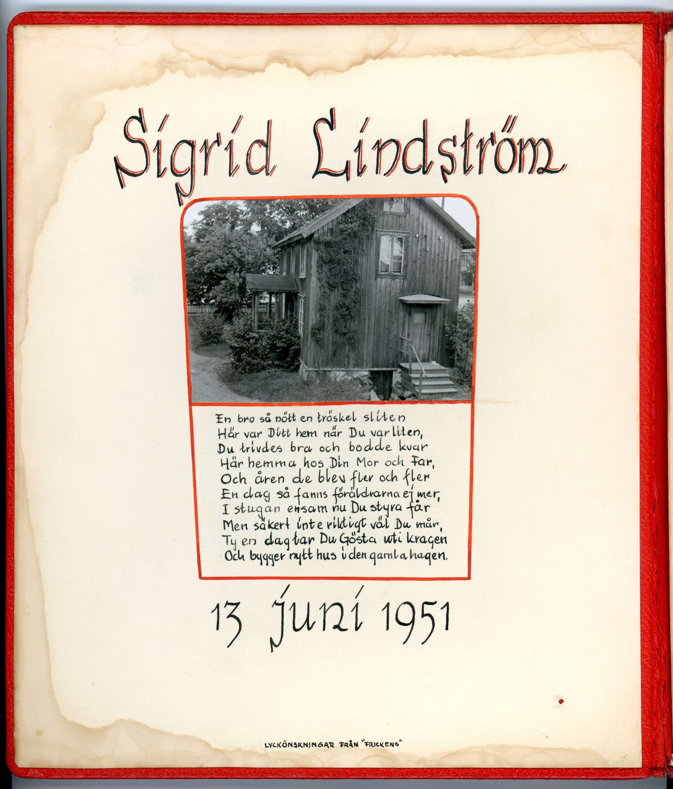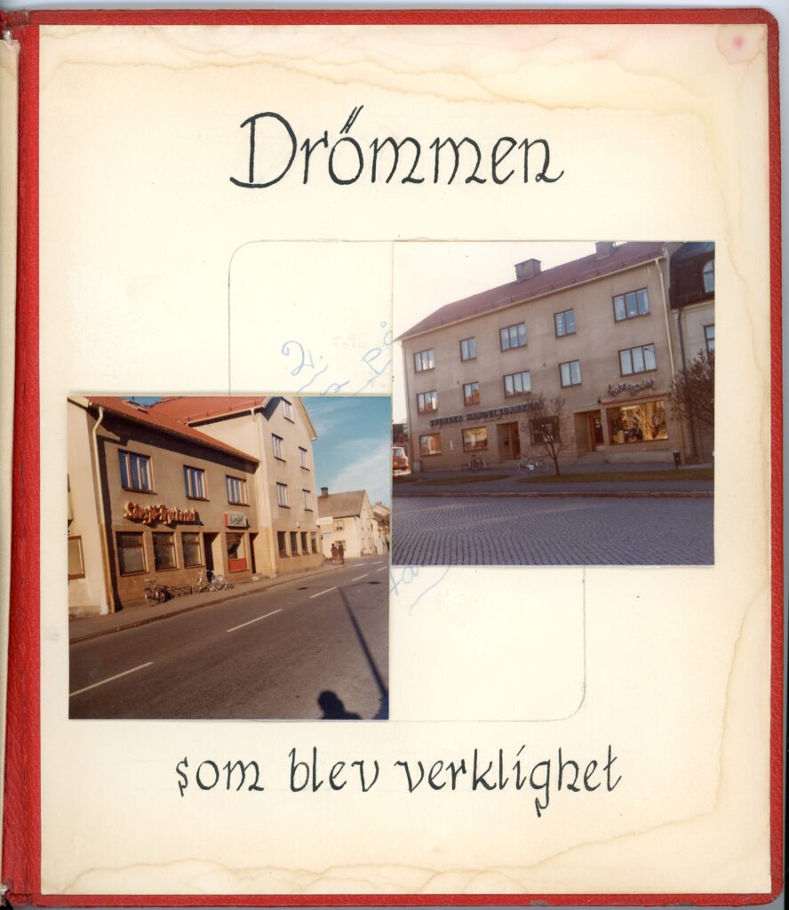 I hörnet Odengatan/Storgatan i centrala Sävsjö låg för länge sedan ett vacker trähus som beboddes av familjen Lindström. Handlaren Oscar Lindström var fadern i familjen och när han dog i lungsot (tuberkulos) 1909 lämnade han sin hustru och två barn efter sig. Barnen, som då var tretton och åtta år gamla, hette Gustaf (ofta kallad Gösta) och Sigrid. Oscars svärfar var en av de tidigast bosatta i Sävsjö och höll bland annat på med ölbryggning och försäljning. Kanske var det denna influens som kom syskonen Lindström att engagera sig i nykterhetsrörelsen, eller så var det det allmänna alkoholmissbruket som pågick i hela landet vid den här tiden, och likväl i Sävsjö. 1916 var det år Sigrid gick med i logen som blev den Logen 369 Sten Sture som vi fått att bevara på Arkiv Jönköpings län. I föreningen var hon mycket aktiv och fyllde genom åren många roller. När hon dog 1994 hade hon varit med i logen i hela 78 år! I arkivet har några av handlingar efter Sigrid hamnat, däribland det här vackra albumet. Dessa minnen är från när föräldrahemmet revs för att göra plats åt ny bebyggelse. Initiativtagare till bygget var Svenska Handelsbanken, som fanns på adressen i ca 70 år. Sigrid var en av de som flyttade in i det nya huset när det stor färdigt 1951. Hon bodde kvar på Storgatan 10 där hon växte upp fram till sina sista år. Här har förutom lägenheter också funnits tryckeri och advokatbyrå. Denna byggnad står än idag kvar mitt i Sävsjö, numera med andra verksamheter.