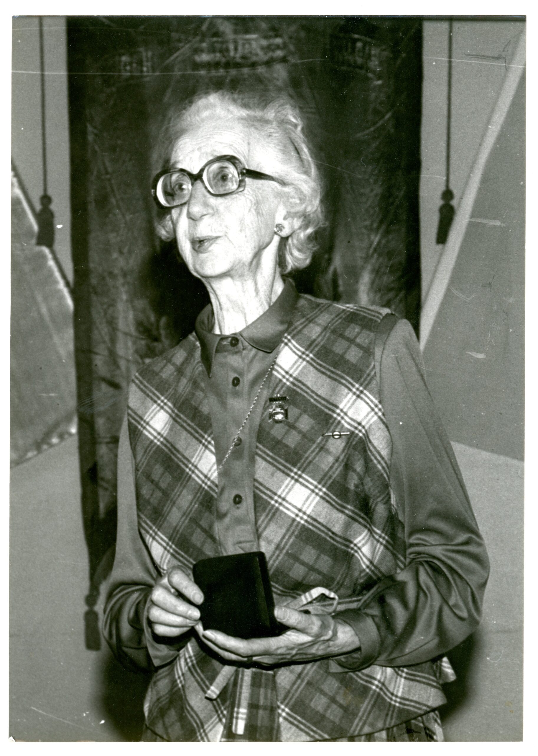 Gammal kvinna med stora glasögon som håller en ask.
