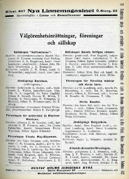 I 1914 års adresskalender för Jönköpings stad finns följande ”Välgörenhetsinrättningar, föreningar och sällskap” omnämnda, i ordning: Sällskapet ”Jultomtarne”Jönköpings Barnhem (Löfvingstorp)Föreningen…